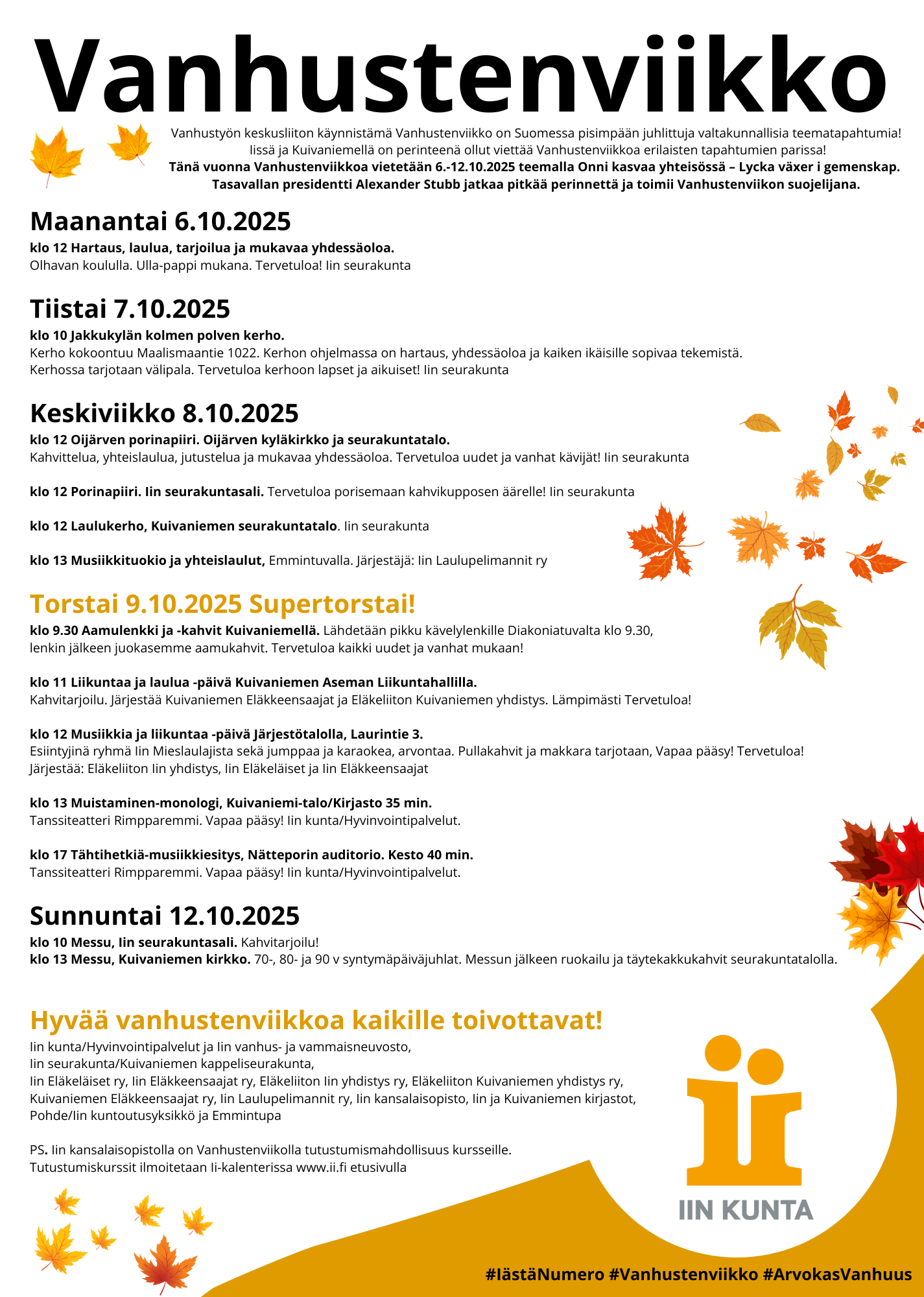 Järjestää: Eläkeliiton Iin yhdistys, Iin Eläkeläiset ja Iin Eläkkeensaajat