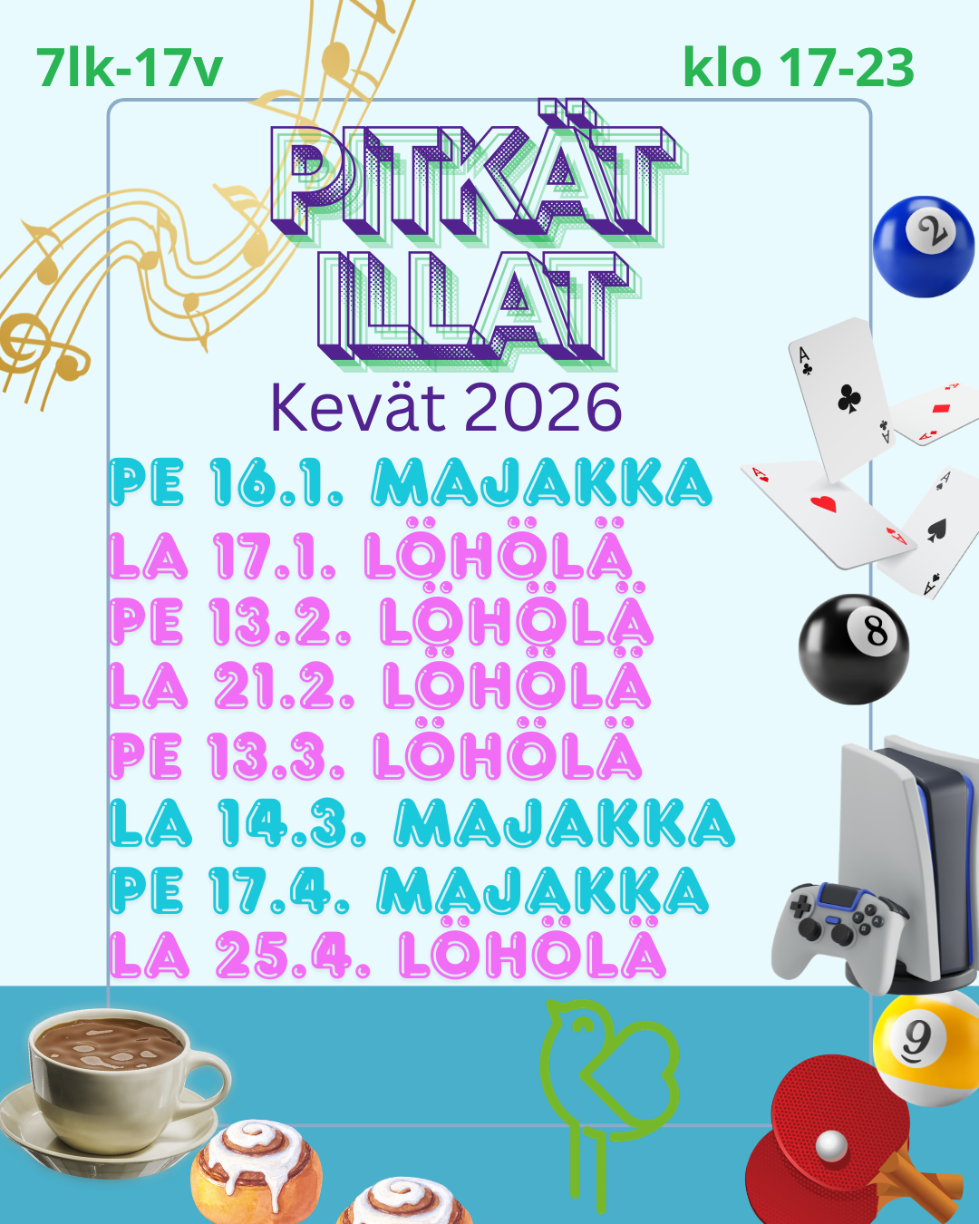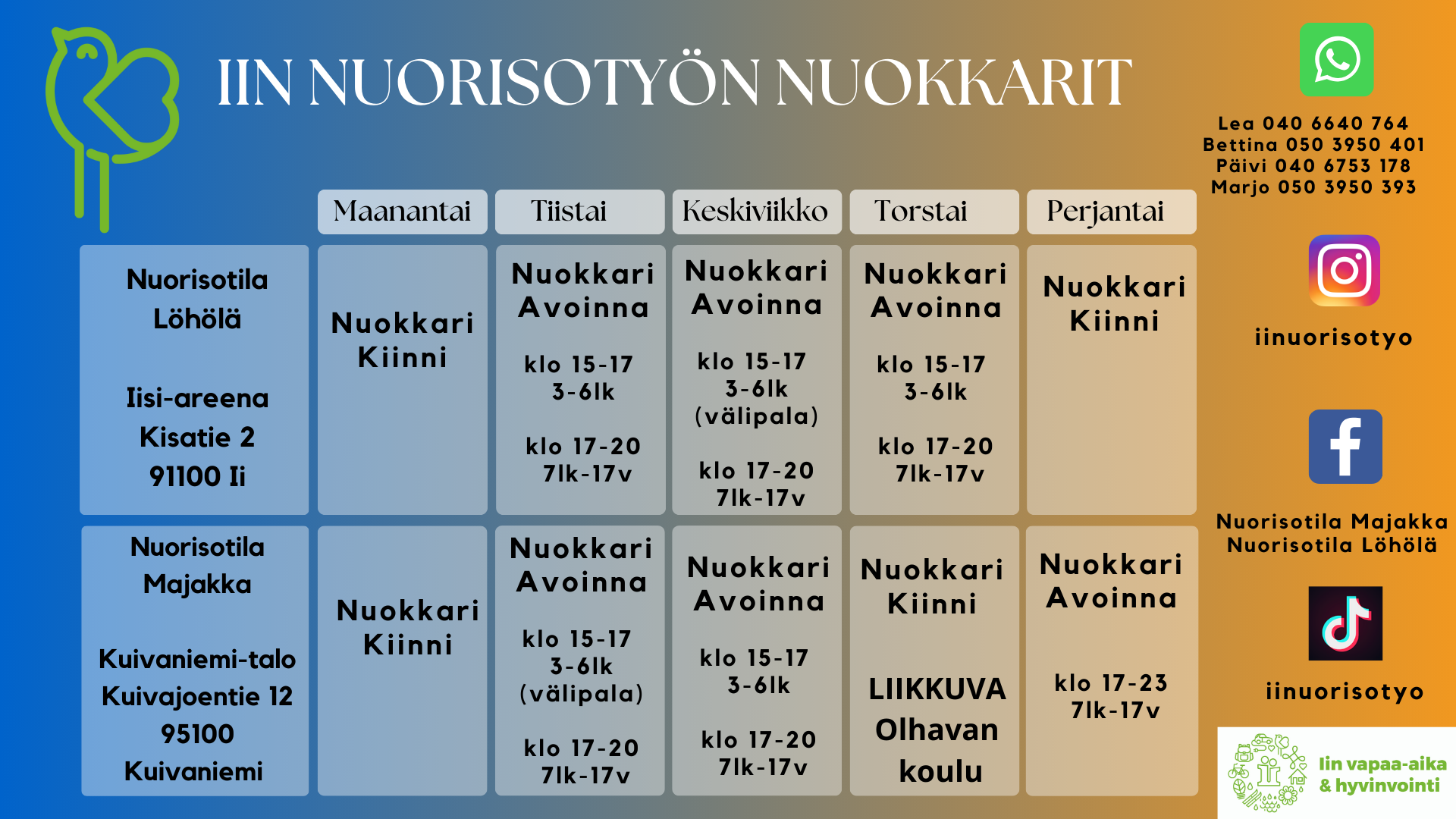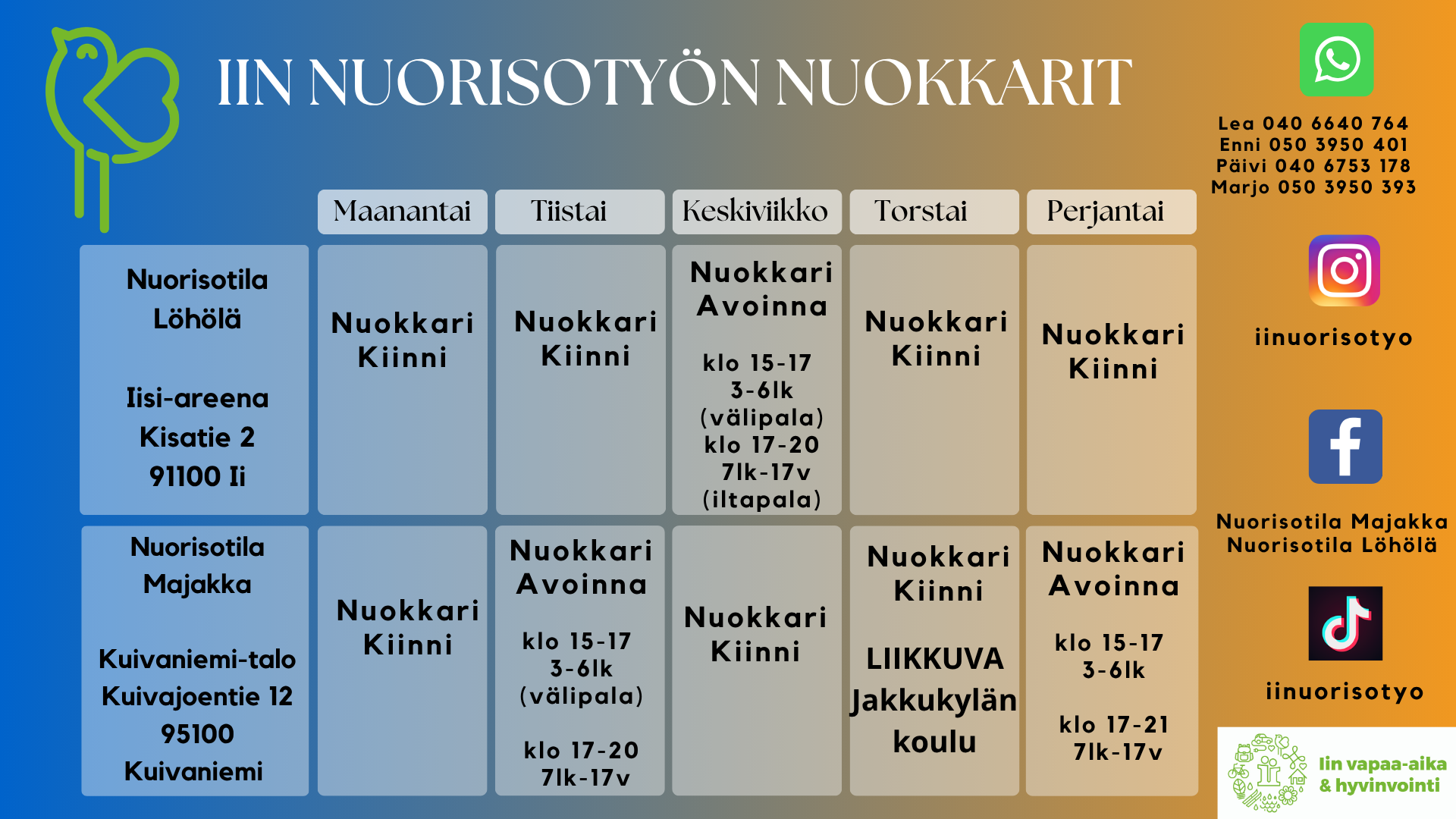 Katso Liikkuvan aikataulut Iin nuorisotyön instagramista (@iinuorisotyö) tai nuokkareiden facebook-sivuilta.